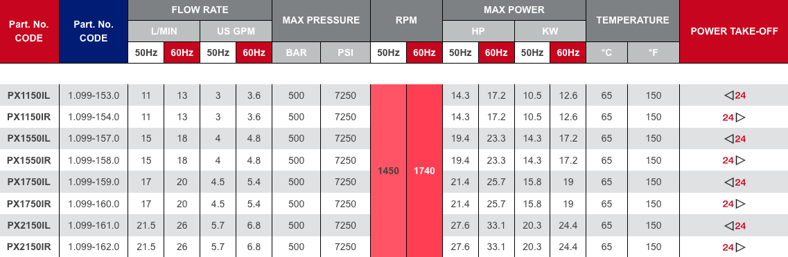 Hawk pístová čerpadla ze série PXI 500 jsou navržena k dosažení maximálního tlaku 500 barů a průtoku 21 l/min, což je činí ideálními pro průmyslové čištění při méně intenzivním používání. Tato čerpadla poskytují vysoký výkon a spolehlivost při různých aplikacích, které nevyžadují nepřetržitý provoz čerpadla.