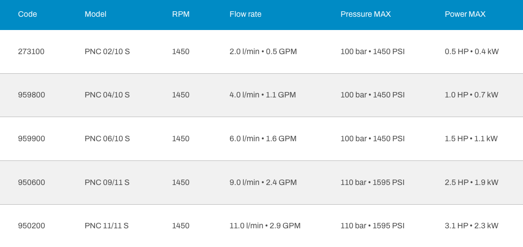 Udor PN pístová čerpadla jsou navržena pro profesionální vysokotlaké čističe a jsou vhodná pro použití s jednofázovými elektromotory. Poskytují spolehlivý výkon s průtokem až 15 l/min a maximálním pracovním tlakem 140 barů, což je činí ideálními pro náročné čisticí aplikace.
