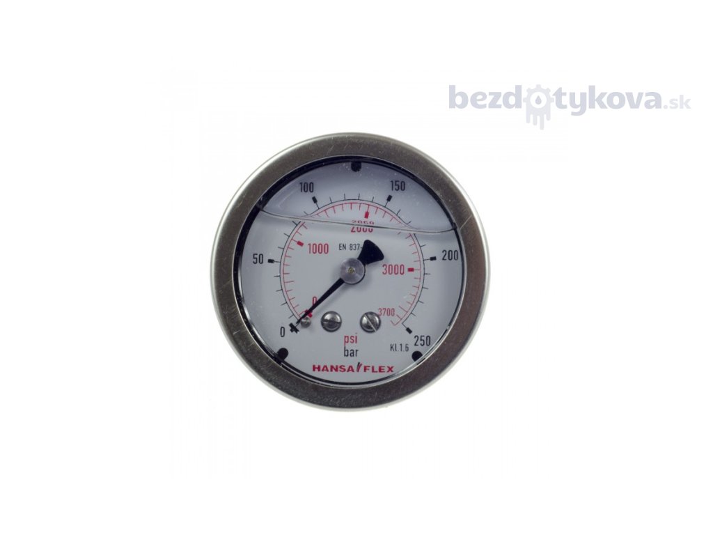 Glycerínový manometr 0-250bar v kovovém obalu. Průměr 63 mm. Zadní nebo spodní připojení G1/4''.
